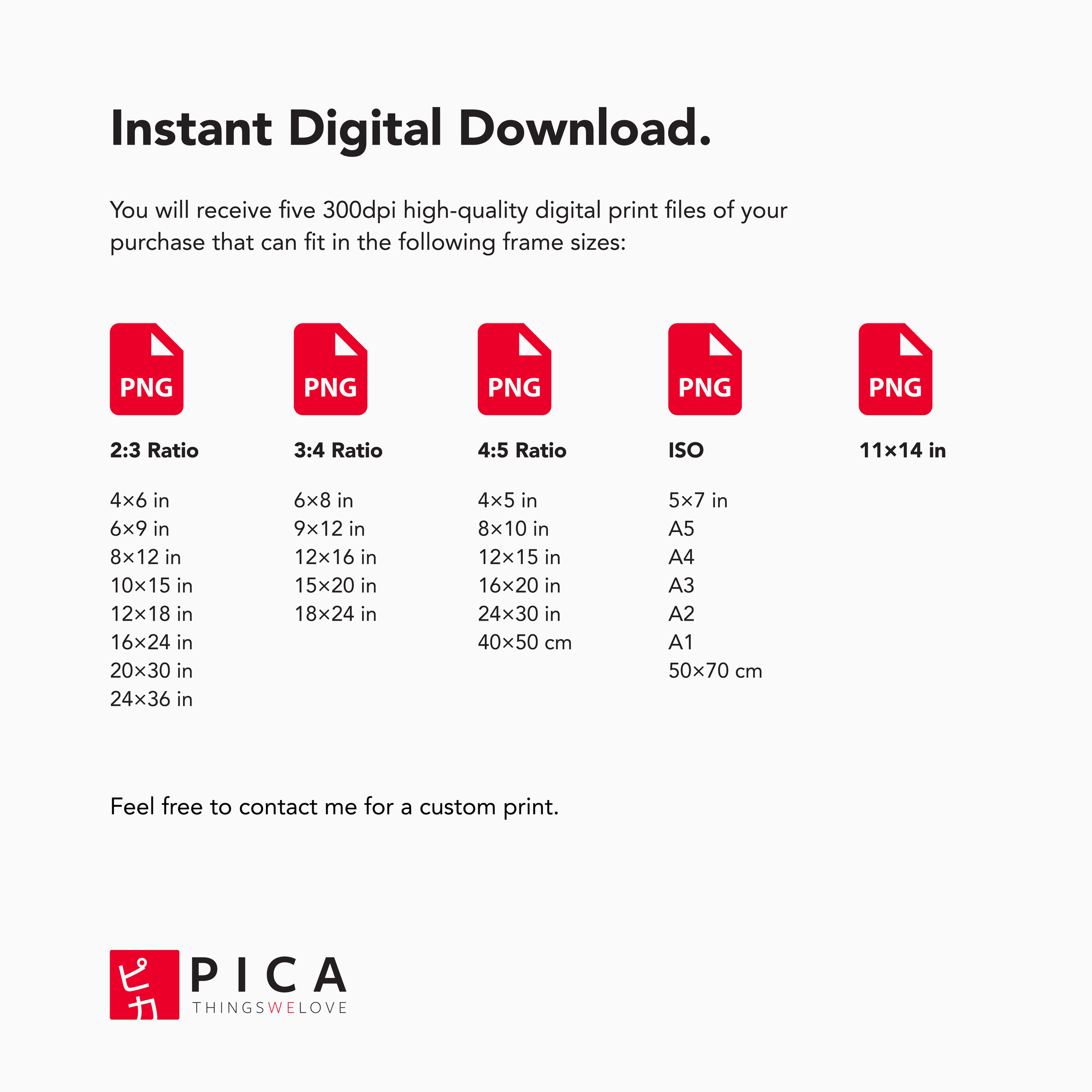 Each offered digital download print will get you five high-quality, high-resolution 300dpi PNG print files in: